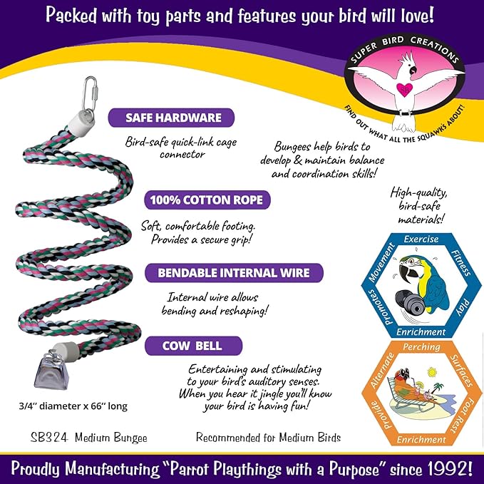 - BIRD SAFE COMPONENTS & DESIGN: As avian professionals worldwide recommend our products, we take pride in offering a bungee bird toy that prioritizes the safety and enrichment of pets. Super Bird Creations ensures that only the finest toy components are used, giving bird owners confidence in providing their feathered friends with a product designed for both entertainment and safety. Intended for Pet-Use only.