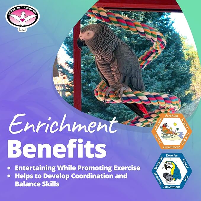 - BIRD SAFE COMPONENTS & DESIGN: As avian professionals worldwide recommend our products, we take pride in offering a bungee bird toy that prioritizes the safety and enrichment of pets. Super Bird Creations ensures that only the finest toy components are used, giving bird owners confidence in providing their feathered friends with a product designed for both entertainment and safety. Intended for Pet-Use only.
