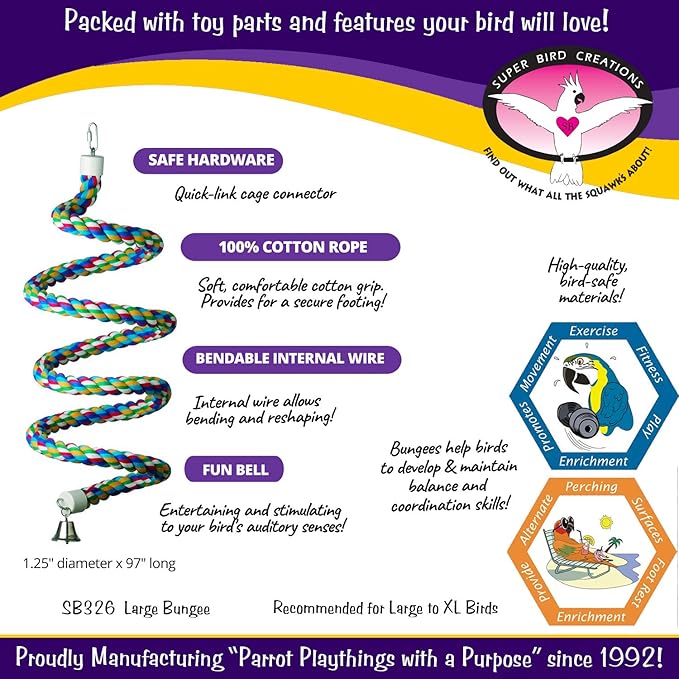 - BIRD SAFE COMPONENTS & DESIGN: As avian professionals worldwide recommend our products, we take pride in offering a bungee bird toy that prioritizes the safety and enrichment of pets. Super Bird Creations ensures that only the finest toy components are used, giving bird owners confidence in providing their feathered friends with a product designed for both entertainment and safety. Intended for Pet-Use only.