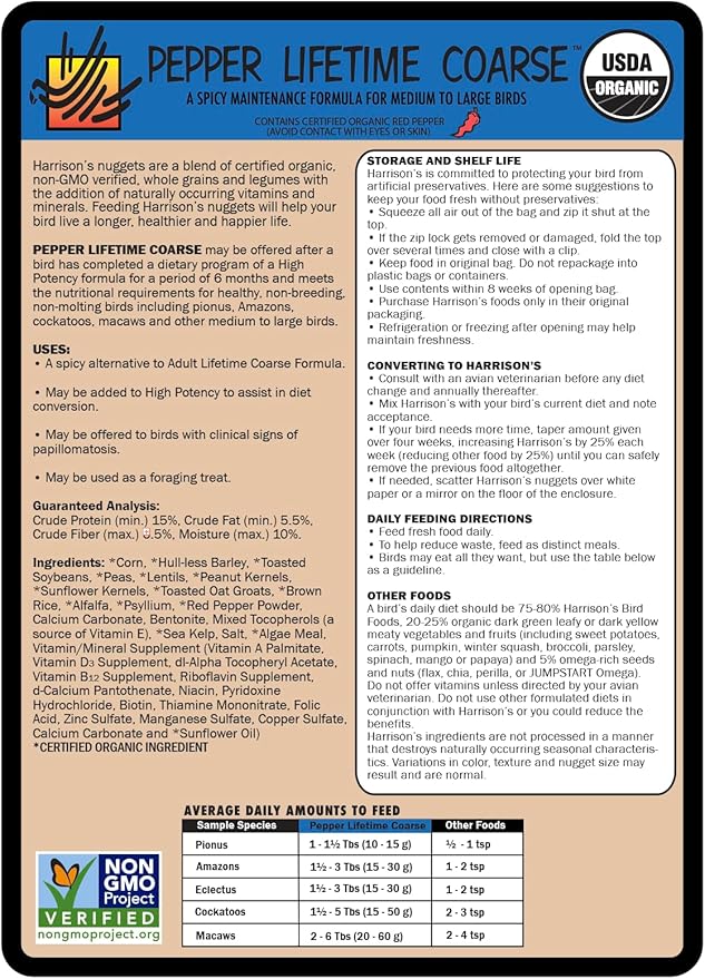 - FOR MEDIUM TO LARGE BIRDS: Pepper Lifetime Coarse, a spicy maintenance bird food designed for pionus, Amazons,African Greys, conures, cockatoos, and macaws.PEPPER LIFETIME COARSE may be offered after a bird has completed a dietary program of a High Potency formula for a period of 6 months and meets the nutritional requirements for healthy, non-breeding, non-molting birds.