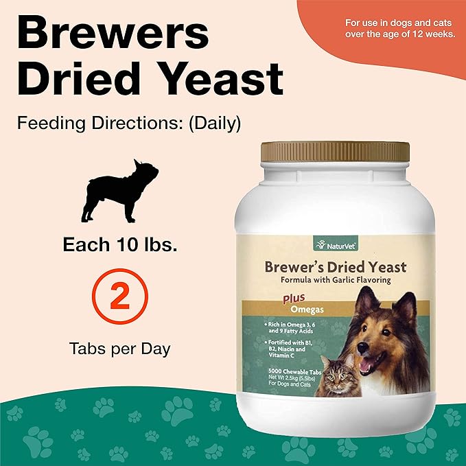 NaturVet – Brewer’s Dried Yeast Formula with Garlic Flavoring – Plus Omegas | Rich in Omega-3, 6 & 9 Fatty Acids | Fortified with B1, B2, Niacin & Vitamin C | For Dogs & Cats | 5000 Chewable Tablets