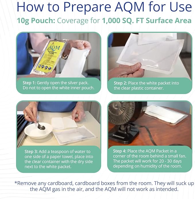 - How to Use: Place the AQM Packet in a corner of the room and open the silver packet; Remove the white pouch and place it back into the clear, self-adhesive protector; Place a slightly moistened paper towel in the protector, then place the protector pack behind a small 4″ diameter fan; The room will be completely deodorized and the packet can produce the gas up to 20-30 days; Depending on the odor, the smell could be gone for years