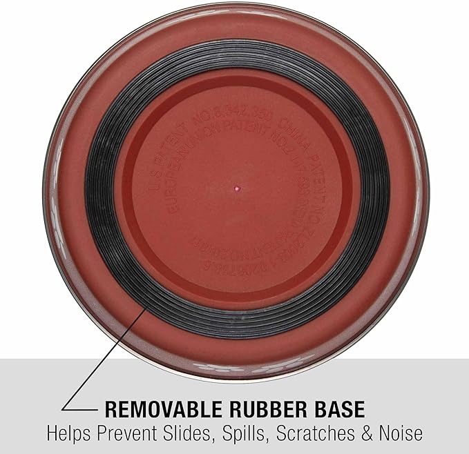 - Removable rubber base prevents skids, spill and noise