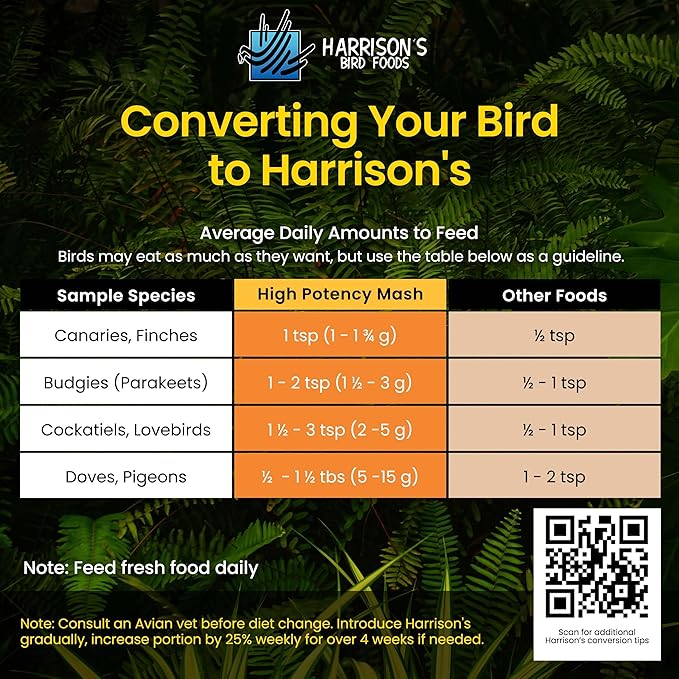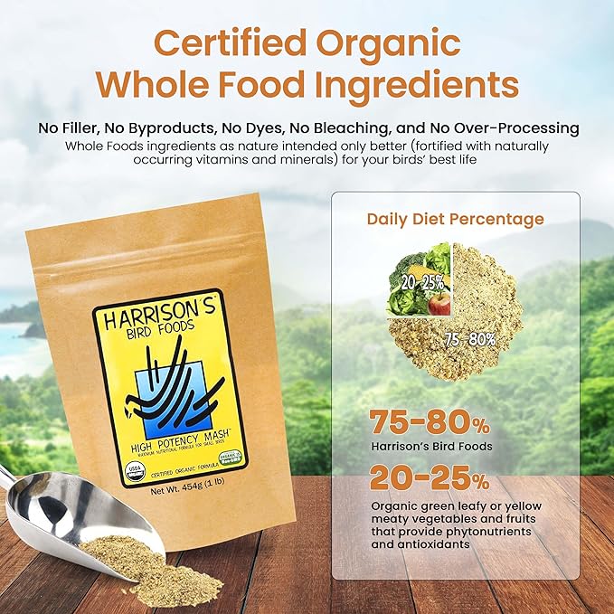 - FOR ALL BIRDS: Elevate your birds' nutrition with Harrison's Bird Foods High Potency Mash - a maximum nutritional formula specially crafted for canaries, doves, budgies, cockatiels, lovebirds, finches, pigeons, and other small birds, but a suitable addition to any bird's diet. High Potency Mash features certified organic, non-GMO whole grains and legumes milled and blended for a complete, balanced diet.