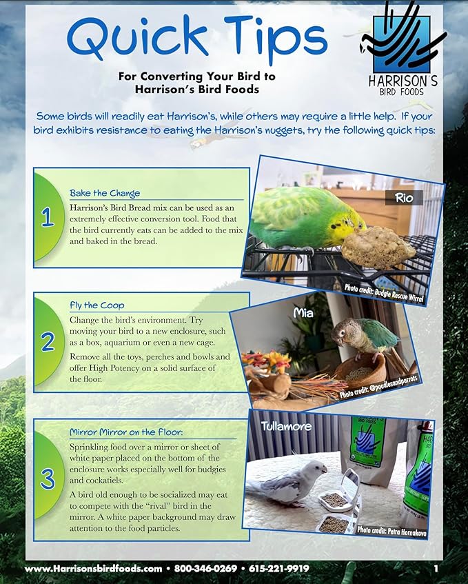 - A MAINTAINANCE NUTRITIONAL PROGRAM FOR MEDIUM TO LARGE BIRDS. Harrison's Bird Foods Adult Lifetime Coarse ensures proper nutrition for birds that are not breeding, molting, recovering from an illness, or free flying. Get the proper nutrition from this parrot food for large birds for your bird's lifetime care.