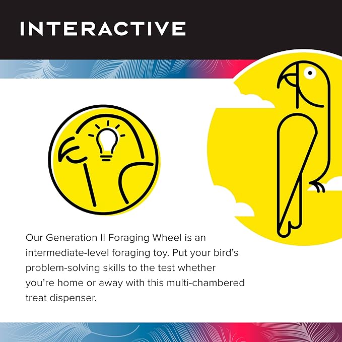 - SPIN FOR FOOD: The Foraging Wheel toy helps introduce your bird to foraging and relieves boredom; Let your bird spin its own personal wheel of fortune to get the food or treats he adores; Foraging systems act as bird feeders and bird toys all in one