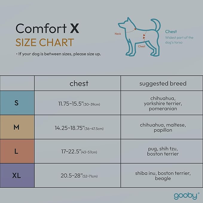 - No Choke Dog Harnesses for Small Dogs – Gooby’s Comfort X Harness is made for small breed dogs. This means that our largest size will fit a dog up to 30 lbs. In order to fully utilize the functionality of the harness, as well as the fit, we recommend measuring the largest part of the dog’s chest and follow the chest sizing. For reference, estimated sizing by weight is Small: 5-9 lbs Medium: 9-15 lbs Large: 15-20 lbs X-Large: 20-30 lbs.