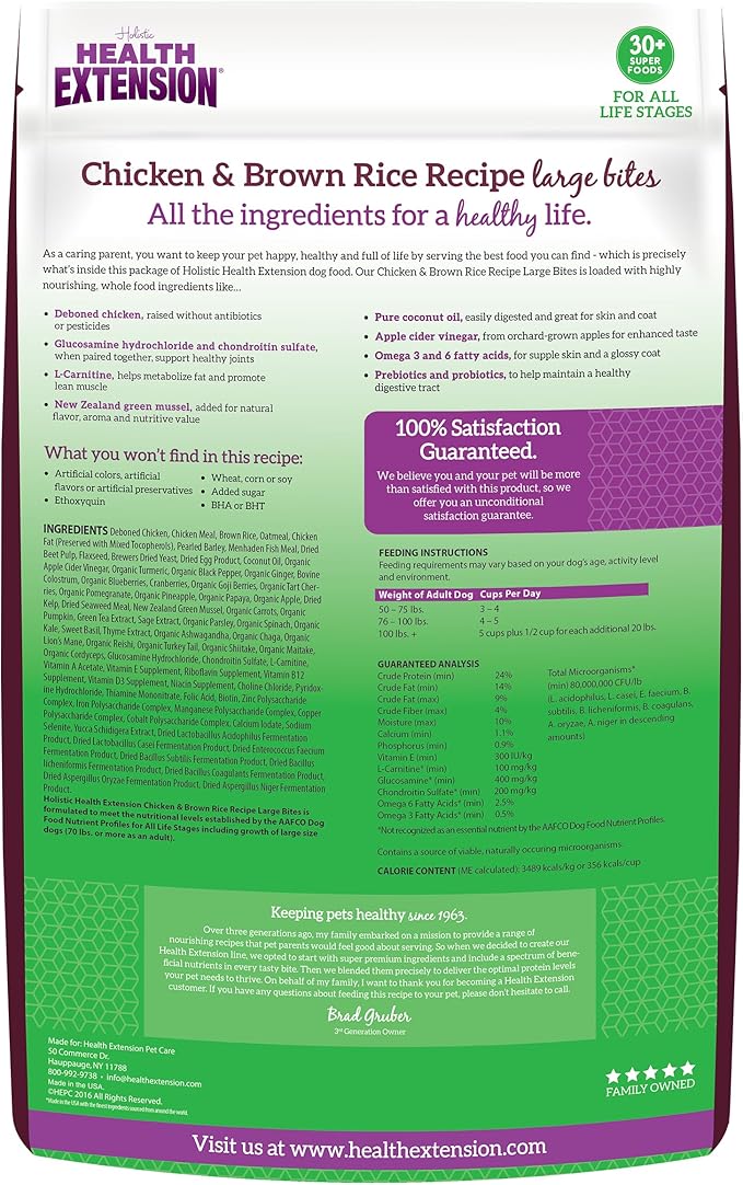 Health Extension Large Bites Chicken & Brown Rice Dry Dog Food, Protein-Rich Formula with Probiotics & Essential Nutrients for Large Breeds (30lb)
