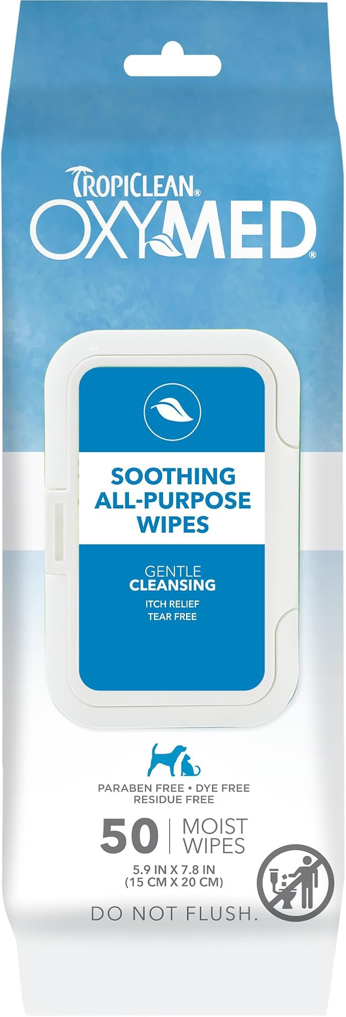 TropiClean Oxymed Soothing Allover Cat & Dog Wipes For Paws And Butt | Anti Itch Relief For Dogs & Cats 50 Count