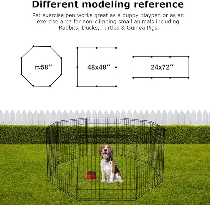 - ✔【STURDY AND DIFFERENT SHAPES METAL DOG FENCE】:The dog playpen made of high-strength solid wire,8-Panel pet fence design allow to configure into multiple shapes, pet fence to hold firmly to the ground while being used outdoors.Dog fence dog playpen exercise playpen for dog.