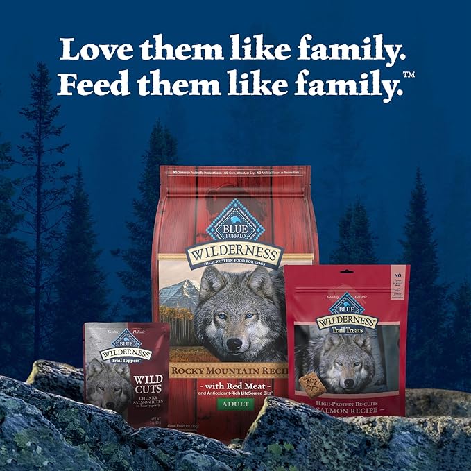 - Contains: Twenty-four (24) 3-oz pouches of BLUE Wilderness Trail Toppers Wild Cuts Wet Dog Food Topper, Salmon Bites