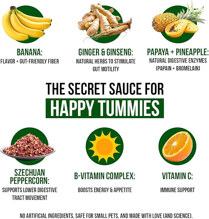 - Papaya Digestive support tablet, flavored with real premium papaya, pineapple (natural sources of digestive enzymes papain and bromelain) and banana that pets grow to love. No Artificial flavors, colors or preservatives.