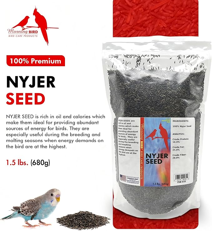 - Packed with Essential Nutrition: Packed with 16% protein and 25% fat, Morning Bird Nyjer Seed offers essential nutrients for energy-demanding seasons like breeding or molting. This high-protein seed helps maintain overall health, vitality, and feather quality.