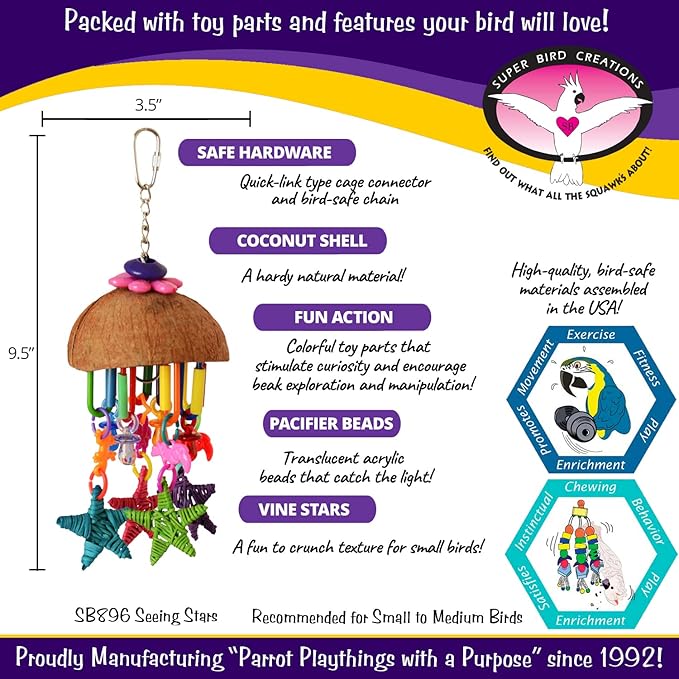 - IDEAL FOR SMALL TO MEDIUM BIRDS: Super Bird Creations' Seeing Stars Toy caters to small to medium birds, including Parrotlets, Parakeets, Cockatiels, Lovebirds, and more. It's an excellent fit for bird cages and offers engaging activities for a variety of bird species, making it a versatile addition to your pet bird's environment.