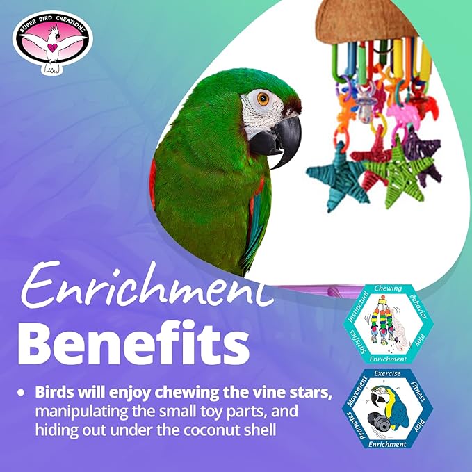 - ENRICHMENT & STIMULATION: Super Bird Creations ensures your bird's mental and physical stimulation. Chewing on vine stars, playing with small toy parts, and exploring the coconut hut enhances their natural instincts and provides essential enrichment to prevent boredom.