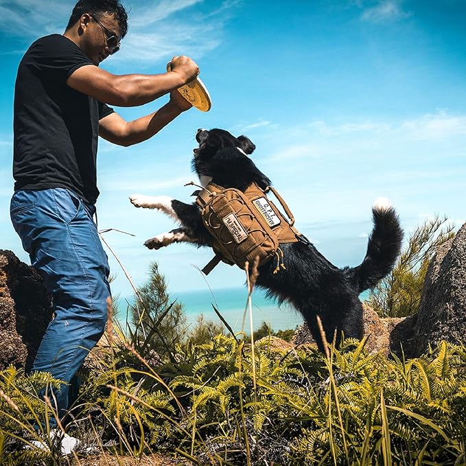 OneTigris Dog Backpack for Medium & Large Dogs, Nylon Backpack for Dogs Tactical Pet Backpack with Side Pockets for Hiking Walking Training Running (Brown, Medium)