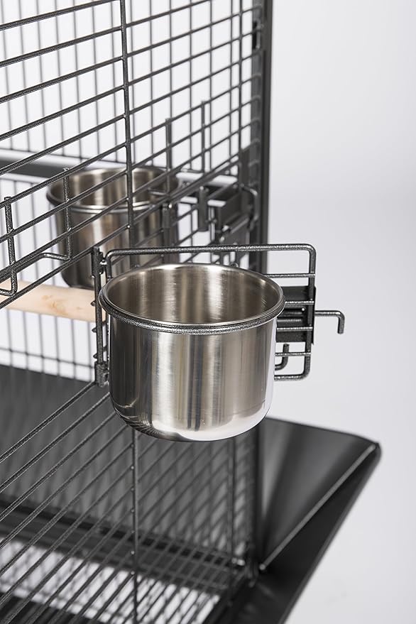 - 2 Stainless steel 24 oz. Cups, a wood perch and rounded corner seed Guard set are included