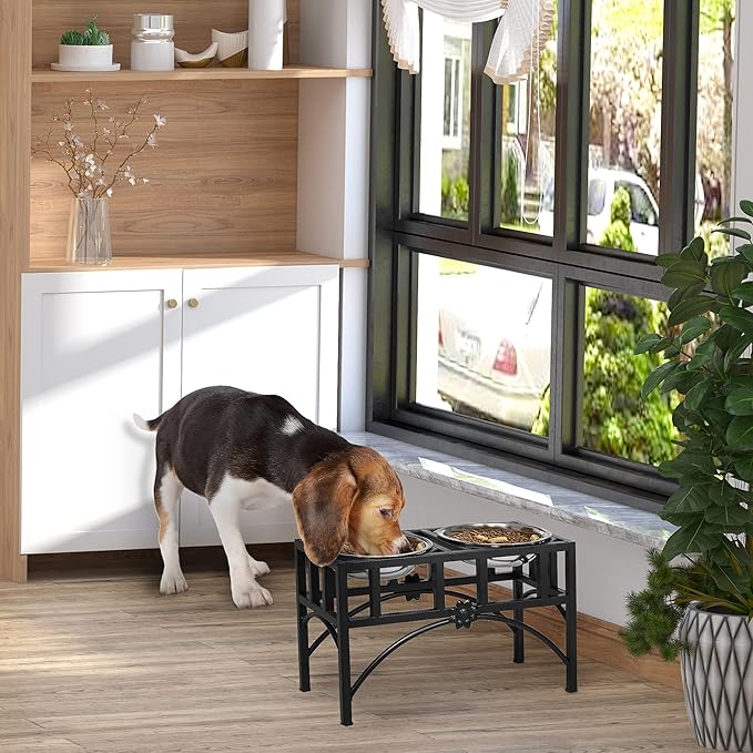 - Design: This dog food bowl stand is a decorative, refined piece of furniture when paired with its surroundings. The look will easily harmonize with the interior décor its stylish details are immersed in.