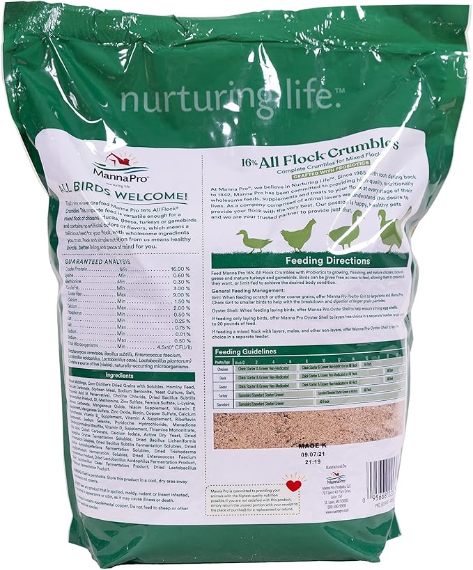 Manna Pro All Flock Crumbles, Crafted with Probiotics for Gut Health & Digestion, 16% Protein for Mixed Flocks with No Artificial Colors or Flavors, Crumbled for Easy Feeding, 8 lbs