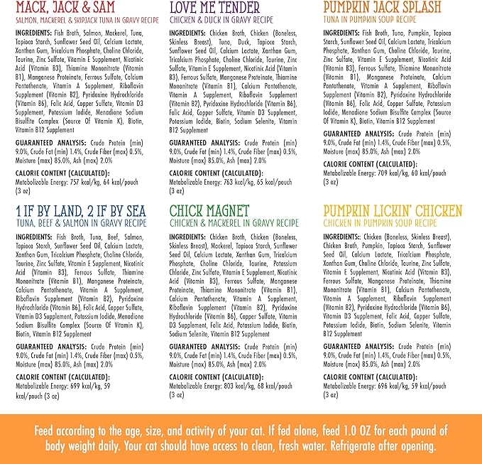 - Pantry Party Pouch Variety Pack (3oz Pouch, Pack of 12) Featuring a variety of cage free chicken, wild salmon, and grass fed beef in a delicious Gravy. An all natural blend of premium proteins that cat’s can't resist!