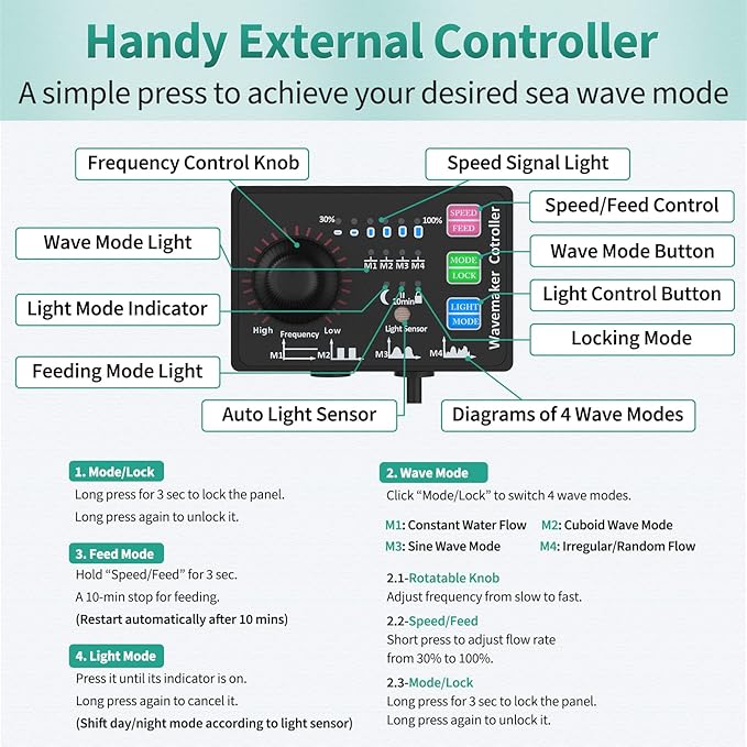 - 4 Optional Waves: Press the “mode” button to switch between 4 wave modes (M1/M2/M3/M4). Easily achieve multiple sea waves with a simple controlling panel.