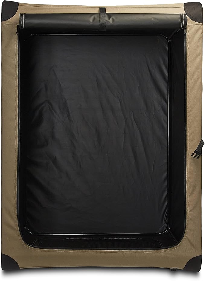 - Includes an XL dog crate made of tan polyester fabric and a lightweight yet sturdy steel frame
