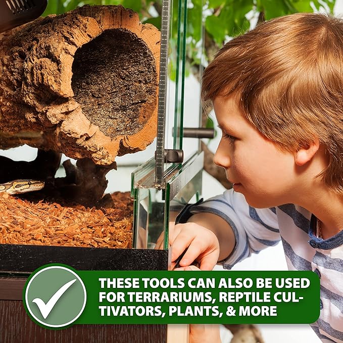 - Black Terrarium Scissors for Indoor Plant and Reptile Habitat Care: These easy-to-clean, long-handled terrarium scissors are ideal for trimming bonsai, succulents, indoor gardens, snake reptile cultivators and maintaining reptile enclosures and habitats.