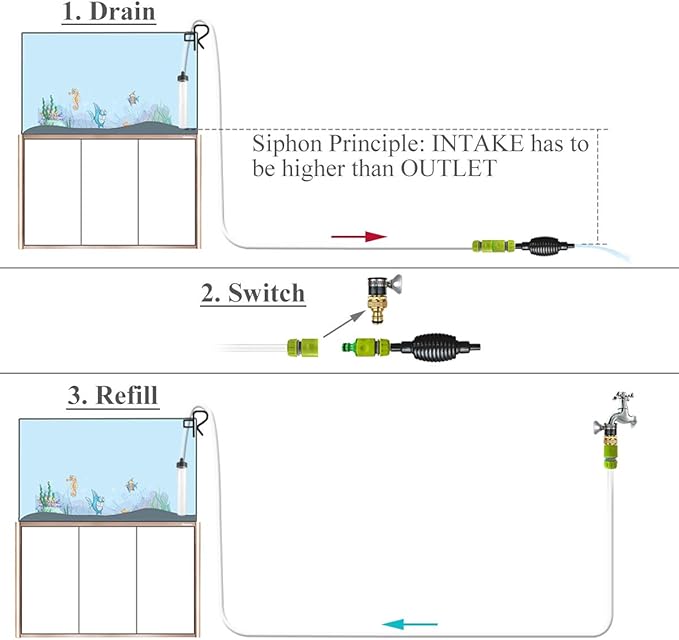 - ✮2-IN-1 FUNCTION: Convenient to siphon fish faeces, impurities, turbid water out of fish tank & refill clean water by switching connector.