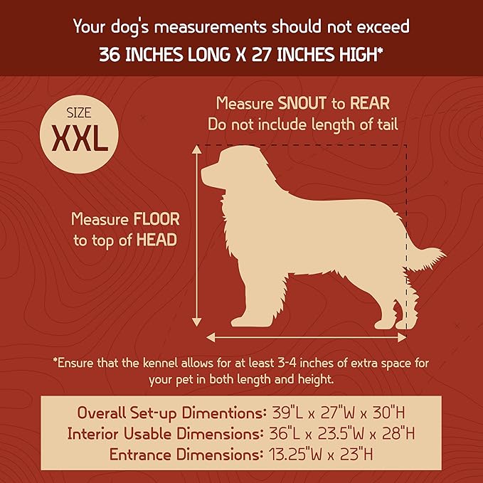 - Spacious & Easy Assembly – Fast setup with locking snaps and bolts. Generously sized at 34.25" L x 23.25" W x 22" H, recommended for dogs up to 36" long and 26" tall.