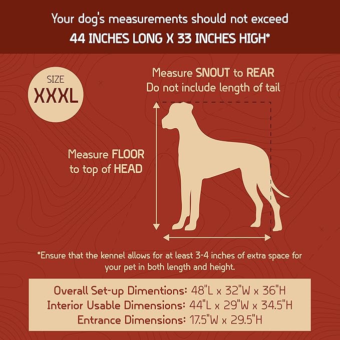 - Your dog’s measurements should be under 44” L x 33” H for 3X-Large kennel