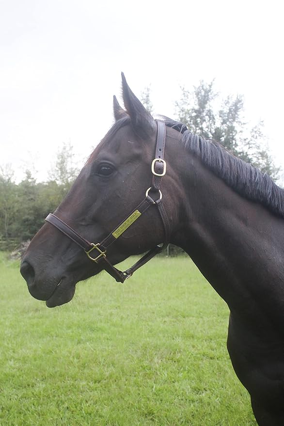 Turnout Leather Halter for Horses with Customized Engraved Name Plate | Brown Leather with Solid Brass Hardware | Fixed Chin, Double Buckle Crown