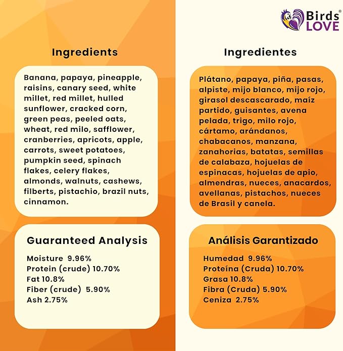 - No added preservatives nor sweeteners: natural sweet fruits to maintain healthy skin, muscles, and feathers