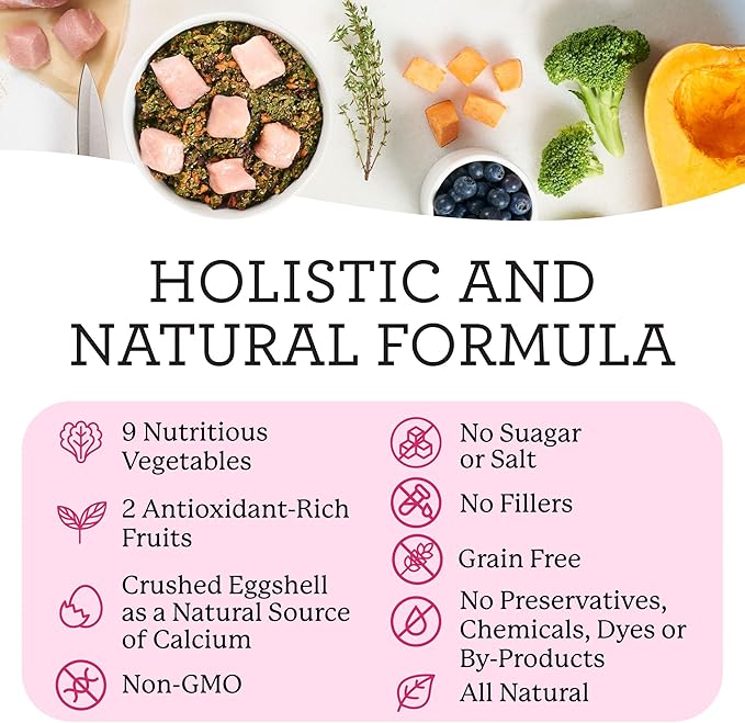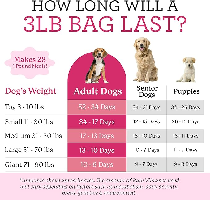 - This 3 pound bag of dehydrated whole superfoods makes 28, one pound meals when combined with a protein of your choice. Guaranteed Analysis: Crude Protein (min) - 11%, Crude Fat (min) - 2%, Crude Fiber (max) - 8%, Calorie Content (Calculated) - 2641 kcal ME/kg; 71 kcal ME/scoop