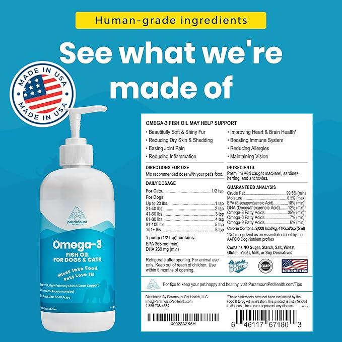 - Easy to Use: Paramount Pet Health liquid omega 3 for dogs and cats is a high-potency, low-odor liquid that blends effortlessly into wet or dry food; evaluated for purity and safety so even picky pets can enjoy every drop