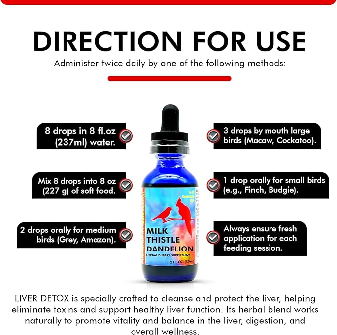 - Safe & Alcohol-free Formula: The alcohol-free formulation ensures this milk thistle liquid is safe for birds of all sizes and species while providing a worry-free health solution for your aviary.