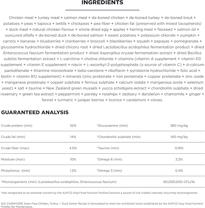 - PROTEIN-RICH FOOD TO SUPPORT STRONG, LEAN MUSCLES: The first six ingredients and 85% of the protein in our grain free CARNIVORE Chicken, Turkey + Duck Senior dog food comes from real premium-quality meat + fish.