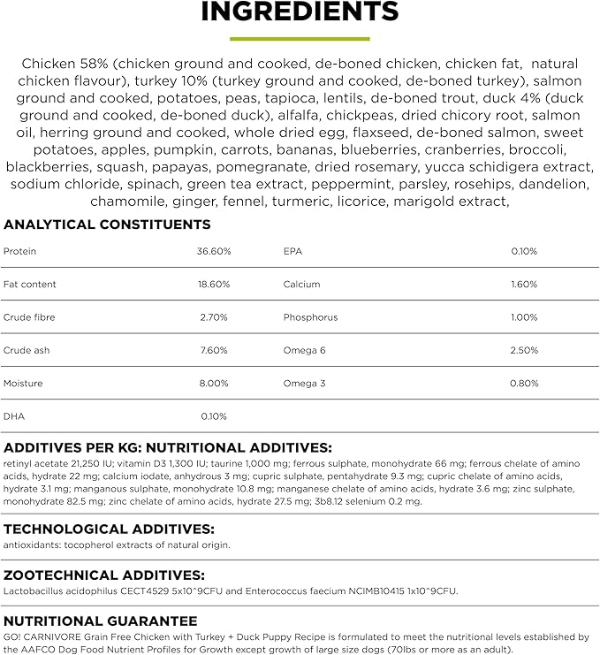 - PROTEIN-RICH FOOD TO SUPPORT STRONG, LEAN MUSCLES: The first six ingredients and 87% of the protein in our grain free CARNIVORE Chicken, Turkey + Duck puppy food comes from real premium-quality meat + fish.