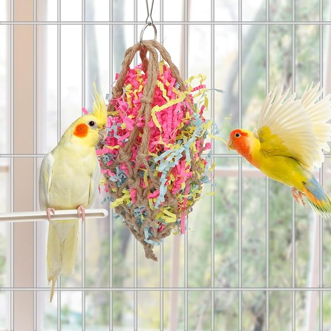 Bird Jute Paper Strips Parrot Mesh Bag Hanging Chewing Toy for Parakeet Cockatiel Conure Cockatoo African Grey Macaw