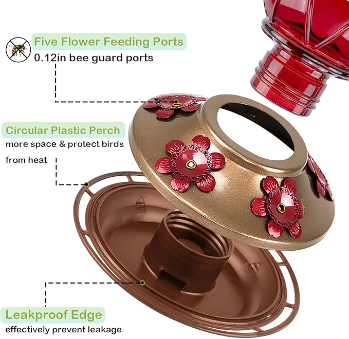 - Effective Feeder: The circular perches provide hummingbirds with plenty of confortable rest space, wide mouth opening and two part base make the feeder a breeze to fill and clean; A metal hanger for versatile placement
