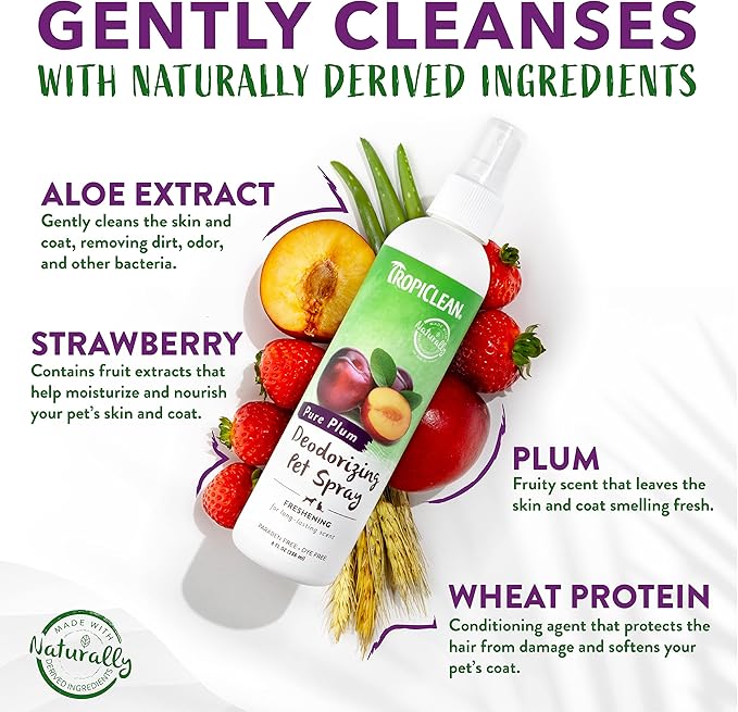 TropiClean Dog Perfume, Long Lasting Plum Cologne, Deodorizing Spray for Smelly Dogs, After Bath Detangling Spray with Vitamin E, Safe for Cats, 8oz.