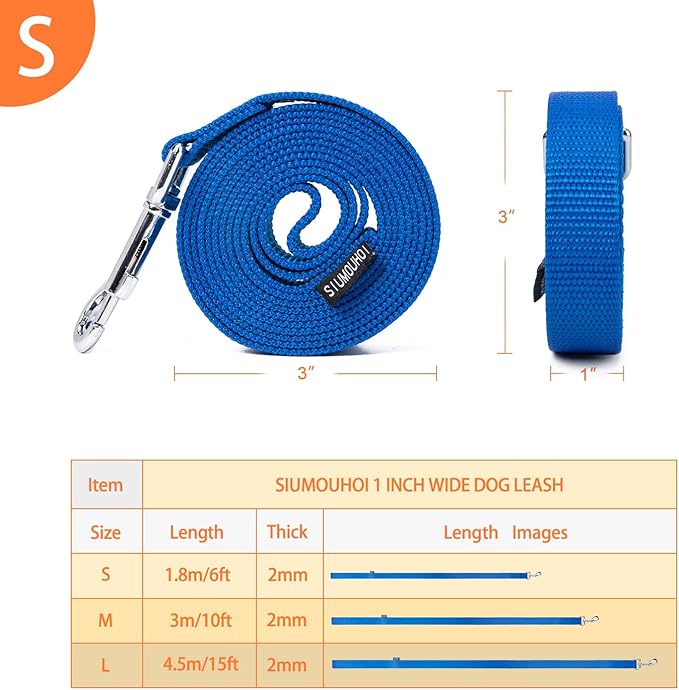 Strong Durable Nylon Dog Training Leash, 1 Inch Wide Traction Rope, 6 ft 10ft 15ft Long, for Small and Medium Dog (Blue, 6 Feet)