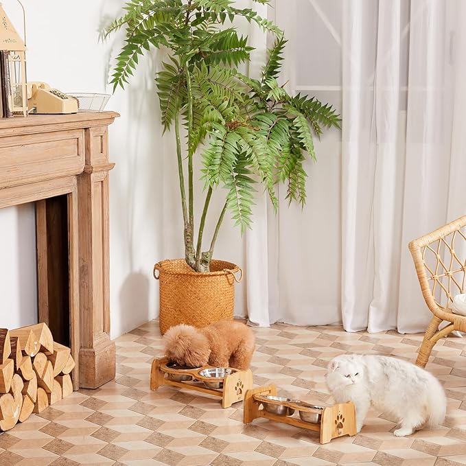 - Stable Anti-Skid: raised dog food bowls is made from Natural high quality bamboo.The dog feeding station with anti slip feet make it stable and does not slide easily, it prevent your pet from sliding bowls around and provide protection for your floors. Increases Anti-slip feet on bowl insets which eliminated the impact sound when pets are eating.
