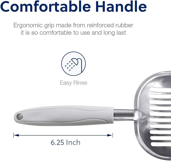- [Functions]: The sharp edge helps to loosen clumps. The sifter area holds wet clumps and lets clean litter pass through easily. The long handle keeps you away from cat’s waste. It is designed to keep litter box clean and save you loads of cat litter.