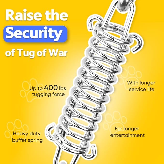 - Shock-Absorbing Spring for Safe Play – The stainless-steel spring acts like a cushion, absorbing shock to protect your dog’s teeth, neck and joints during intense tug sessions. Rust-resistant and weather-proof for all-season outdoor fun