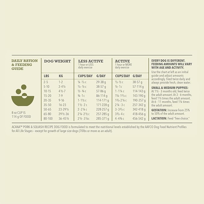 - ACANA dog food offers a recipe rich in protein from a single animal source** that is balanced with butternut squash, pumpkin and sweet potato to help your dog maintain a healthy weight