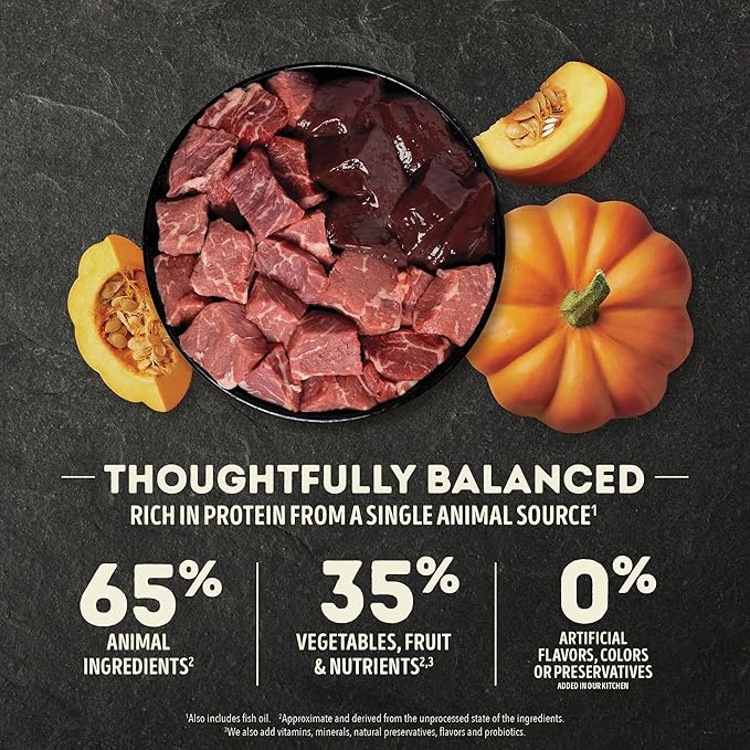 - High protein dog food recipe features 65 percent** high-quality beef ingredients and 35 percent*** wholesome fruit, vegetables and nutrients, and features a freeze dried dog food coating