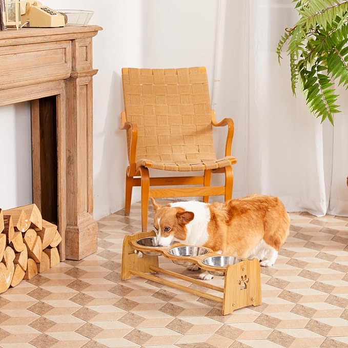 - Stable Anti-Skid: raised dog food bowls is made from Natural high quality bamboo.The dog feeding station with anti slip feet make it stable and does not slide easily, it prevent your pet from sliding bowls around and provide protection for your floors. Increases Anti-slip feet on bowl insets which eliminated the impact sound when pets are eating.