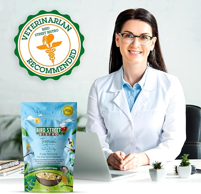 Bird Street Bistro Parrot Food for Parakeets & Cockatiels - Tropical - 18 oz - Cooks in 3-15 min, Natural & Organic Grains, Fruits & Vegetables - USA Made