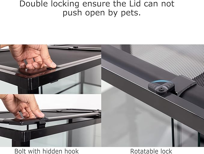 - 【Tempered Glass Terrarium】Screen top provides ventilation and allows uvb and infrared penetration. Raised bottom frame can be fit a substrate heater; All glass is high quality tempered glass, which is sturdy and safe. Waterproof bottom makes this tank can be used both as desert terrarium and tropical tank.(Please do not drill holes on tempered glass, the glass may be crack.)