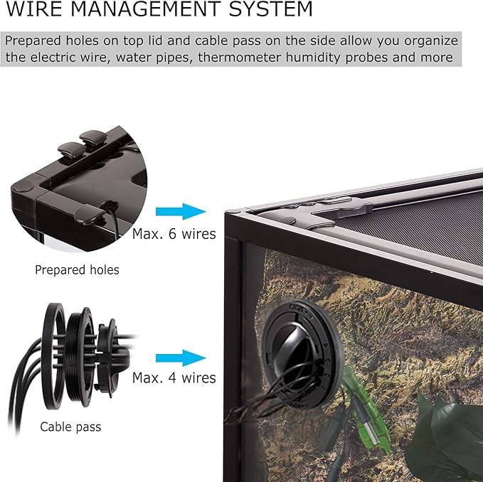 - Included Components : Raised bottom frame, Front sliding opening doors, Tempered glass tank, Top screen ventilation, Waterproof bottom, 6 inlets for wires and tubing, Cable pass additional wires, Security buckle lock, Removable top mesh screen, Special raised base heat mats, Water-tight hinged Grommet cable management Raised bottom frame, Front sliding opening doors, Tempered glass tank, Top screen ventilation, Waterproof bottom, 6 inlets for wires and tubing,… See more